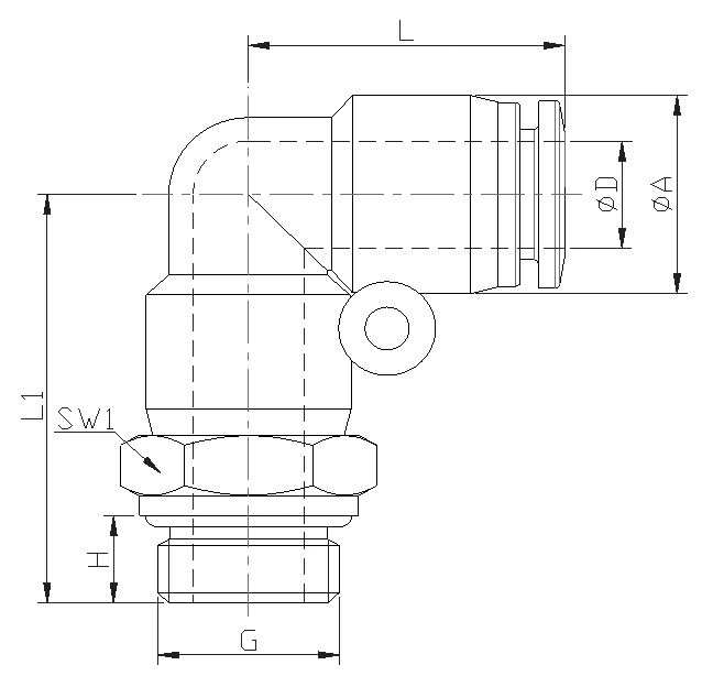 Заказной номер - Фитинг быстроразьемный цангового типа, пластиковый, угловой с внешней (наружной) резьбой G для пневматической трубки.