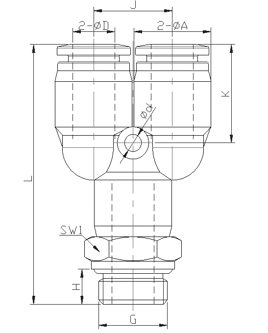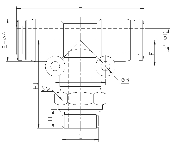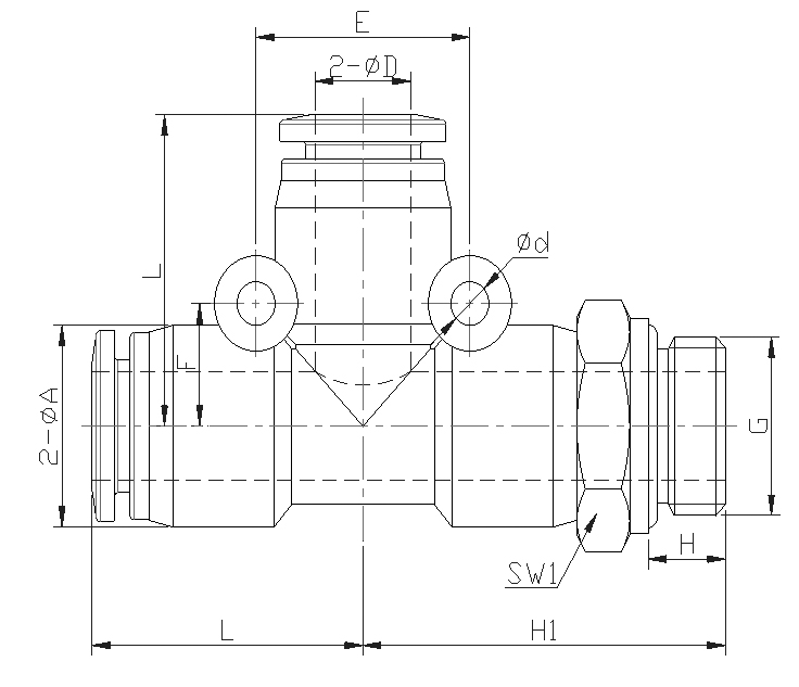 Заказной номер - Фитинг быстроразьемный цангового типа, пластиковый, тройник с внешней (наружной) резьбой G для пневматической трубки.