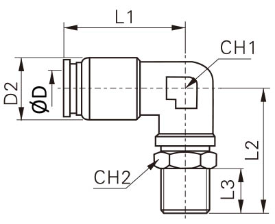 - Фітинг кутовий під 90°, швидкорозємний, цангового типу з зовнішньою різьбою з нержавіючої сталі SUS316 під трубку 4, 6, 8, 10, 12, 14, 16мм.