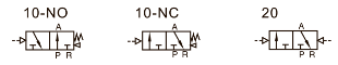 [2] — Нормально відкритий — без подачі пневматичного сигналу керування на клапан, порт живлення (P→A) відкритий, порт вихлопу (R ) закритий.