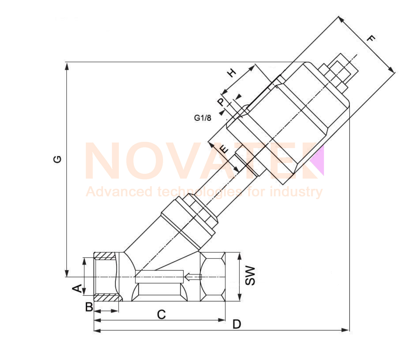 | Порт | DN (мм) | Привід | A | B | C | D | E | F | G | H | P | SW |