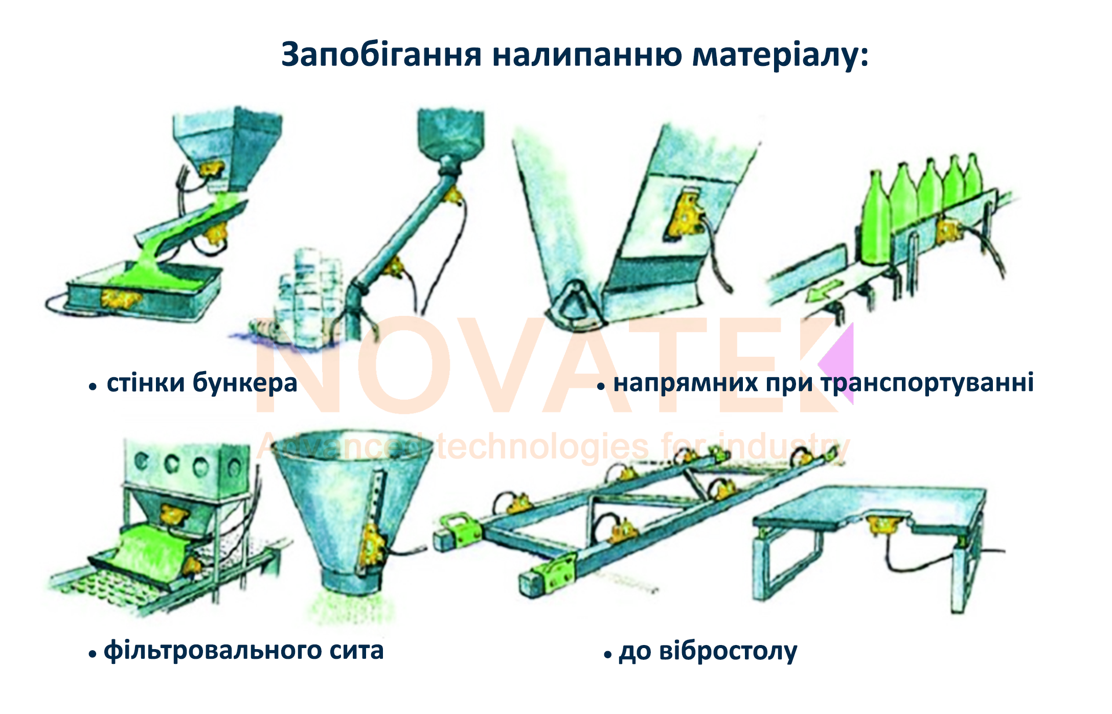 - Області застосування: запобігання налипанню матеріалу на стінки бункера, вібростолу, фільтруюче сита; випорожнення бункера; транспортування матеріалу.